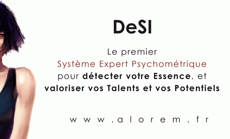 DeSI (Developpement Systemic Inventory), est le premier Système Experts Psychométrique dédié à la détection de l’Essence et des Dons d’une personne, à la compréhension de ses mécanismes de motivation, et à la valorisation de ses Talents et au décodage de ses Potentiels. C’est la première suite de tests psychométriques interactifs qui permet d’identifier avec précision vos besoins en matière de Développement Personnel…